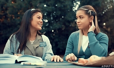 schlanke zierliche asiatische studentin findet trost im sinnlichen lesbischen liebesspiel mit ihrer sexy vollbusigen lehrerin