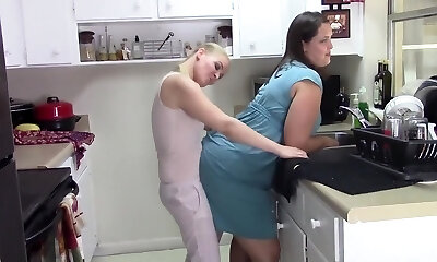 Wife banged rock-hard with tongue while washing dishes in the kitchen, getting her to jizz before her stepmom gets home.